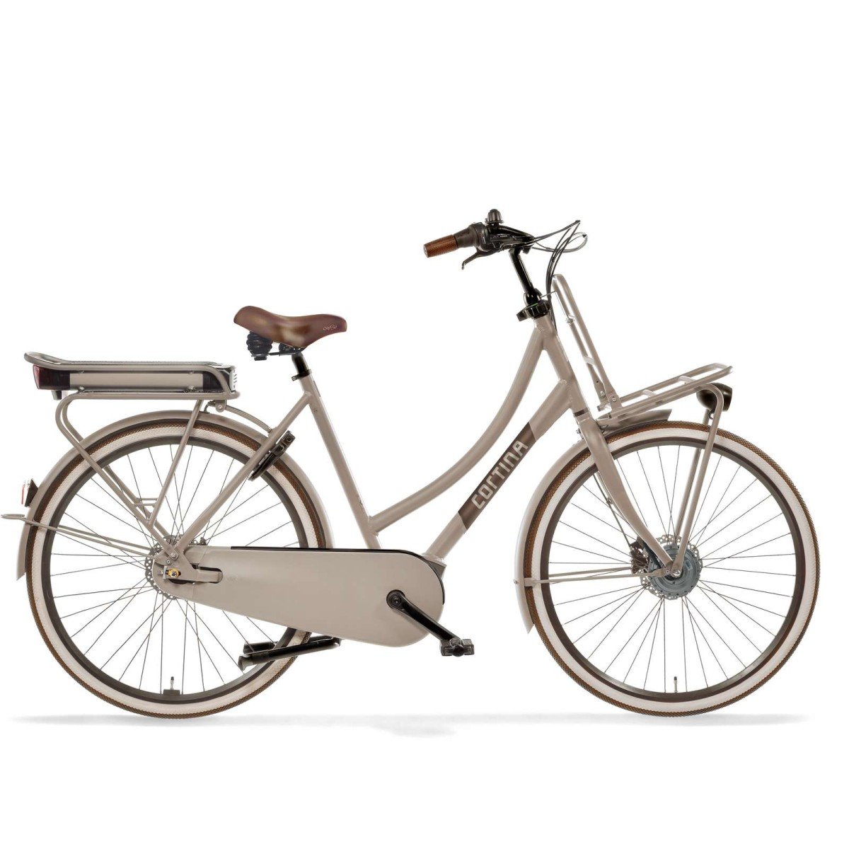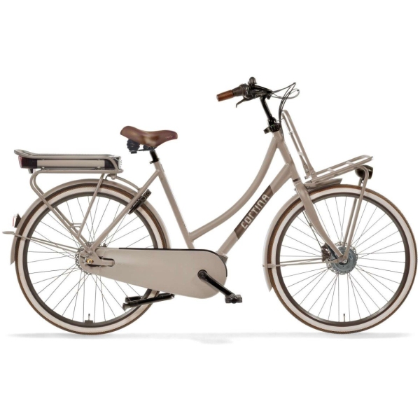 Cortina elektrische damesfiets Transport U4 in framemaat 50cm, Warm Sand Matte. Uitgerust met een Shimano Nexus 7 versnellingsnaaf, hydraulische schrijfremmen voor en achter, Sportdrive Ecomo 36v systeem met voorwielmotor, wordt geleverd ZONDER accu en acculader.
