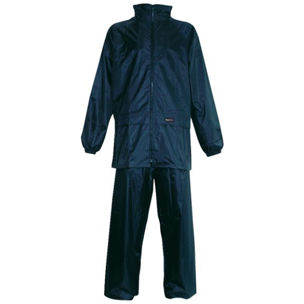 Compleet regenpak. Het jack is voorzien van een ritssluiting, capuchon opvouwvbaar in kraag, koord aan onderzijde met snelstoppers, elastiek in de mouweinden. De broek is met elastiek in de taille en de broekspijpen zijn te versmallen d.m.v. drukknopen.